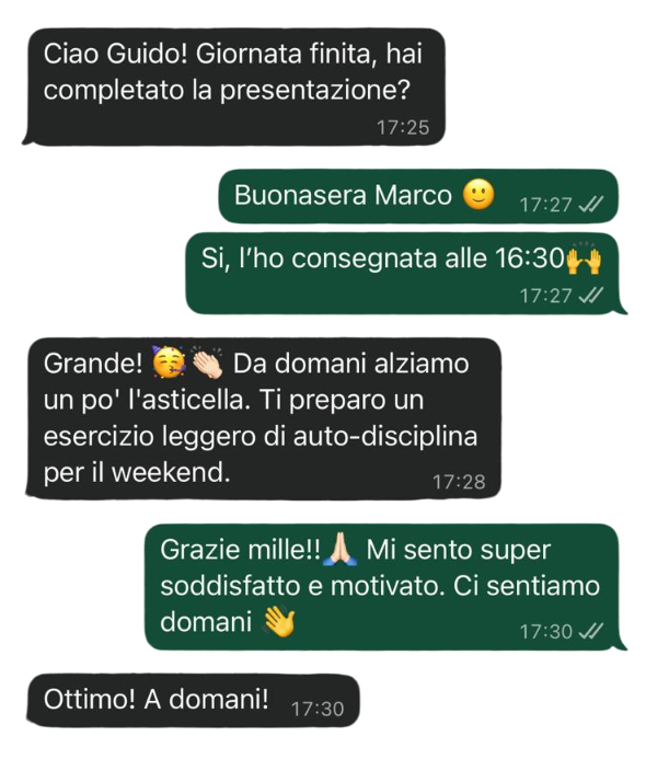 Un professionista umano, sempre lo stesso per tutto il percorso (se scegli un piano con supporto). La chat non è gestita da un bot: potrai scrivere ogni volta che vuoi, e riceverai risposta entro 24 ore nei giorni feriali.